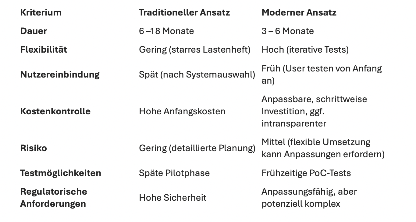 Die Wahl zwischen einem traditionellen oder modernen Auswahlprozess für ein Lagerverwaltungssystem (LVS) hängt von den spezifischen Bedürfnissen und Rahmenbedingungen eines Unternehmens ab. Während der traditionelle Ansatz eine umfassende und risikominimierende Planung ermöglicht, zeichnet sich der moderne Ansatz durch hohe Flexibilität und schnellere Implementierungszeiten aus. Die folgende Tabelle gibt einen detaillierten Überblick über die Unterschiede zwischen beiden Methoden: