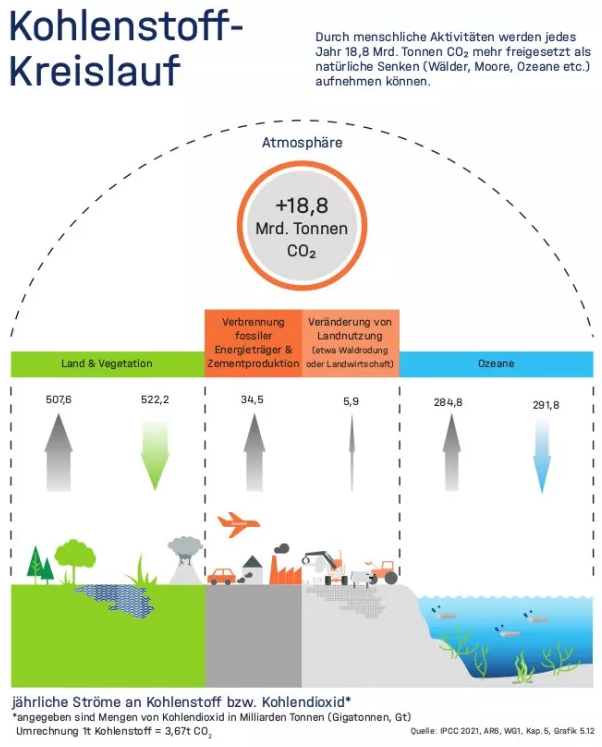 Entscheidend ist, wieviel CO2 jährlich wieder aus der Atmosphäre aufgenommen wird. Tatsächlich werden durch die Natur an Land jährlich 814 Gigatonnen CO2 wiederaufgenommen. [5] Das ergibt also eine Differenz, sozusagen ein Saldo, von 18,8 Gigatonnen pro Jahr (basierend auf den Daten von 2021), welche jährlich in die Atmosphäre hinzukommen.