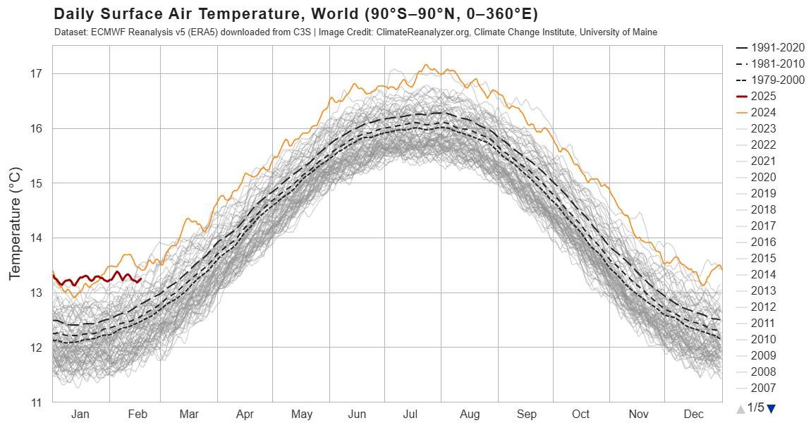 Ein weiteres Zeichen für den globalen Erwärmungstrend ist die Tatsache, dass die 10 Jahre mit den höchsten täglichen Durchschnittstemperaturen die letzten 10 Jahre sind, von 2015 bis 2024. Die orangene Kurve in dem oberen Graphen ist die des Jahres 2024.