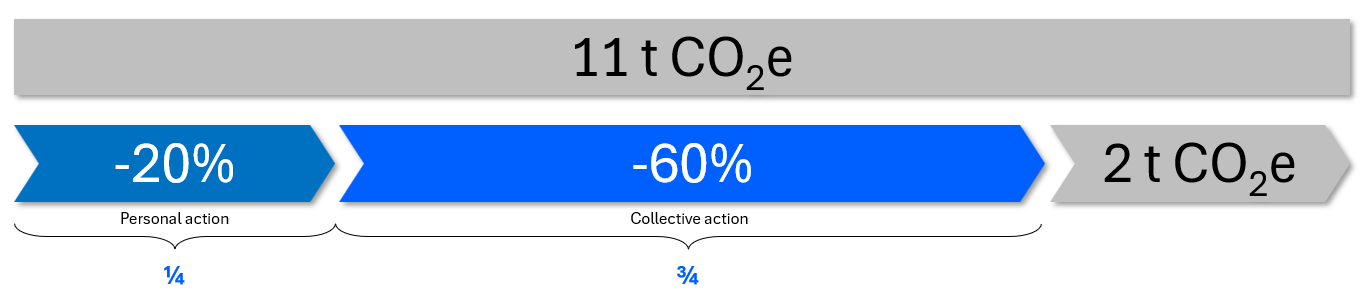 60% der notwendigen Reduzierung werden nur durch politische und kollektive Initiativen möglich sein. Um unseren persönlichen CO2-Fußabdruck zu reduzieren, müssen sich auch Unternehmen und der Staat drastisch verändern, denn die Reduktion unseres individuellen CO2-Fußabdrucks wird durch das soziale, technische und politische Umfeld, in dem wir leben, stark eingeschränkt.