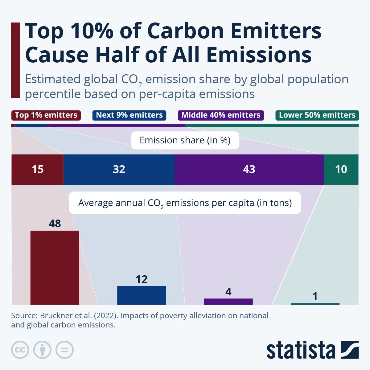 Übrigens: Die persönlichen Emissionen der obersten 0,001 % – derjenigen mit einem Vermögen von mindestens 129,2 Millionen US-Dollar – sind so groß, dass die individuellen Konsumentscheidungen dieser Menschen die gleichen Auswirkungen haben können wie landesweite politische Interventionen. [9]
