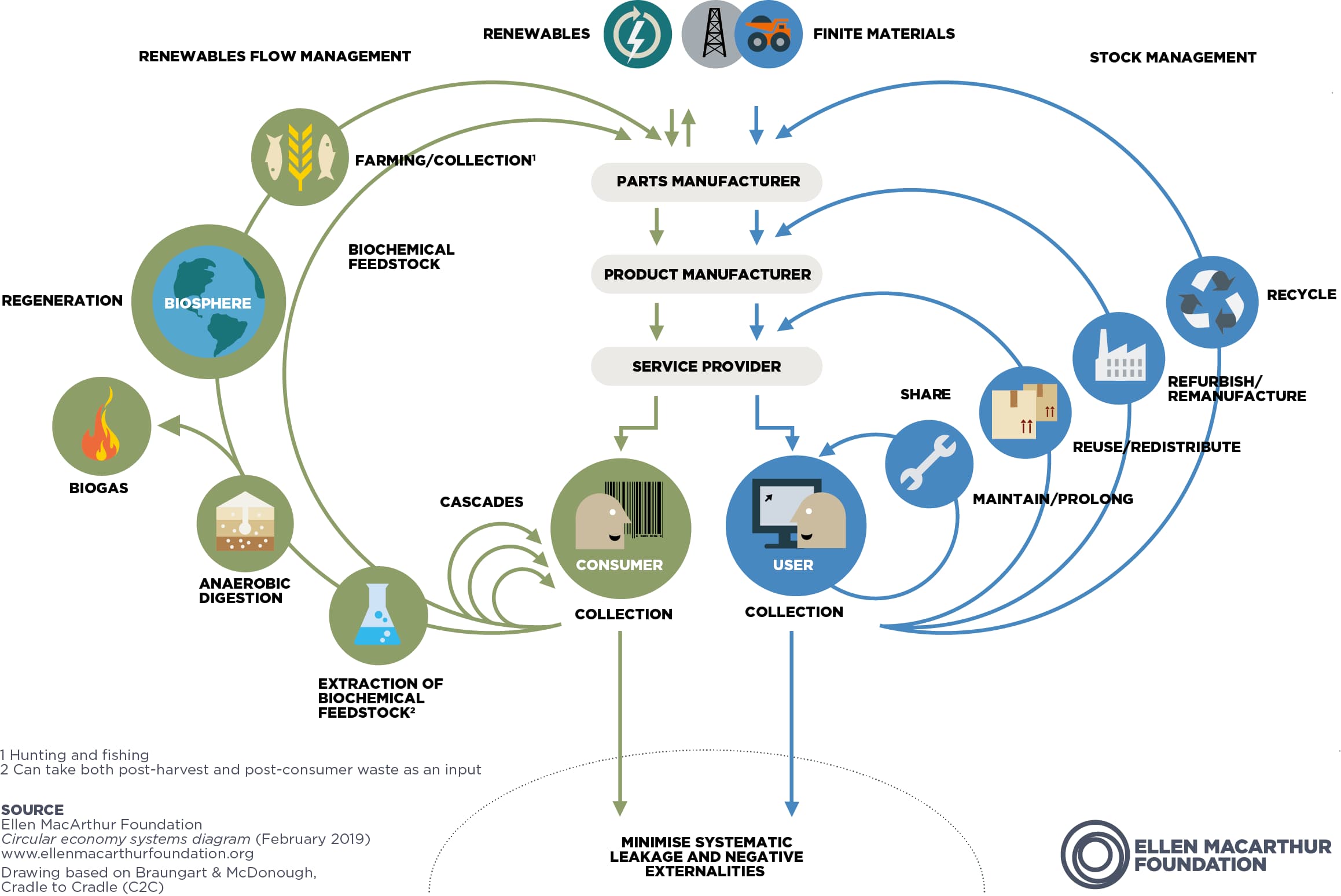 Das Kreislaufwirtschaftssystem, auch Schmetterlingsdiagramm genannt, veranschaulicht den kontinuierlichen Materialfluss in einer Kreislaufwirtschaft. Es gibt zwei Hauptkreisläufe – den technischen und den biologischen Kreislauf. [5] Oder anders gesagt: Die Technosphäre, die Zyklen der Industrie, die den Abbau einiger technischer Materialien in der Natur beinhalten, und die Biosphäre, die Zyklen der Natur.